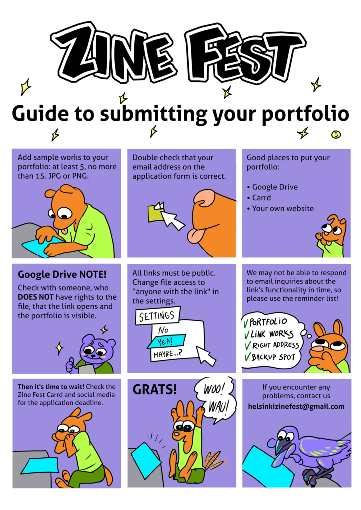 - You can compile your portfolio as a PDF or as separate images. Portfolio should be delivered as a Google Drive -link for example, or through similar means. You can also use a site/platform of your choosing, as long as the images meant for Zine Fest portfolio are clearly displayed and labelled. Note! Social media account is not accepted as a portfolio.
